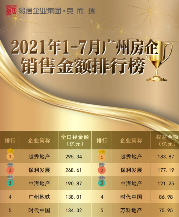 8月6日,克而瑞独家发布《2021年1-7月广州房企销售榜》,公海赌船710地产以亮眼业绩表现再次斩获权益金额榜、全口径金额榜双料第一。